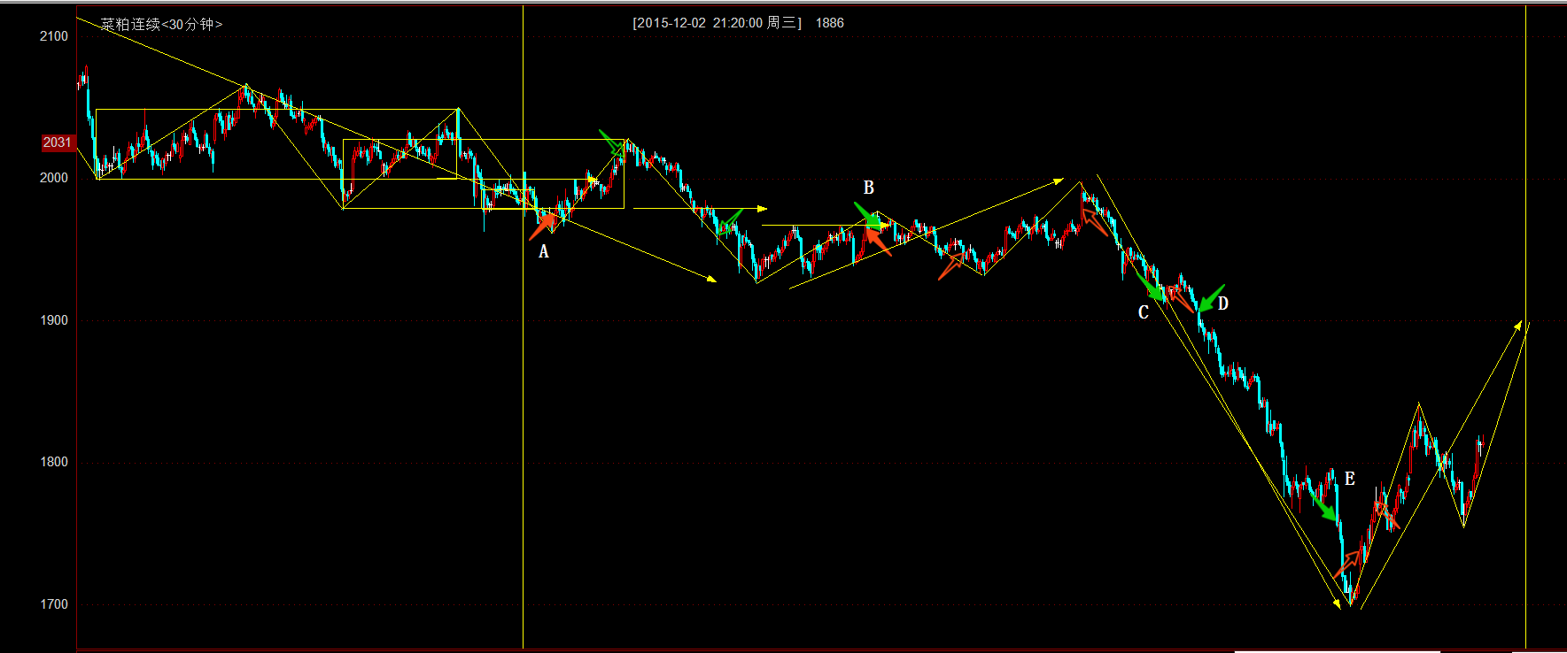 B处为30F + 5F双盘,其后走出了5F的反向走势,但是这里并没有拿住。到C之前一直没有很好的卖点,C处中枢突破下锁仓,后来再次拉回,锁仓失败,不如不锁。而后在D处,有一个1F的中枢拉回,出掉了所有的持仓。结果很快,就迎来了一波迅猛的趋势行情。非常可惜。这里就是说,在5F走势的最开始,套到了5F的走势,结果最后在一个1F的反预期就出了,非常可惜。