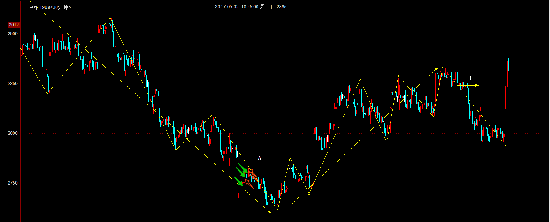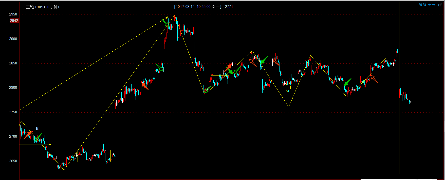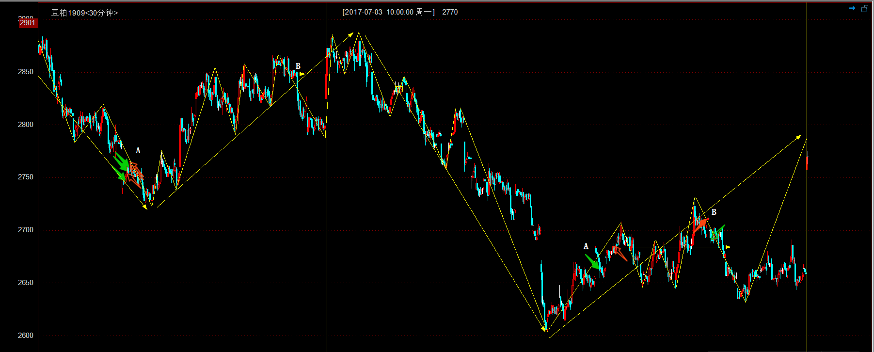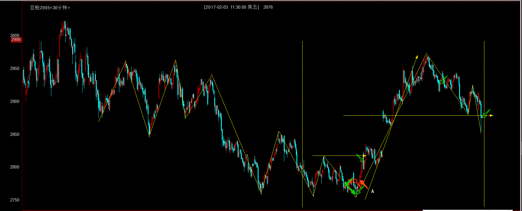 A: 这里双盘处折腾损了三次,最后才吃到1F级别5F级别的双盘,双盘跑出的空间不少,也是严格按动止策略30F级别分型动止,400F分型动止,5F级别三笔反平仓出的,但是前面的三次止损还是有点疼,最后利润还是没多少。
