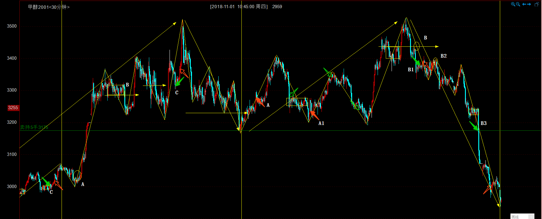 A: 5F级别盘背套30F三买,这个套比较大,止损也大,所以只开了5手,后面盈损比超过1:1就设了保本出局了。A1这里出了一个1F级别盘背套5F级别二买,那么再进,这次动止了一份,不过又是保本出了。这里因为都采取了比较保守的策略,反而没有拿到成了的利润。不过A1这里,已经动止过了,其实是可以把剩下的止损移到一买低点,因为止损其实并不大。