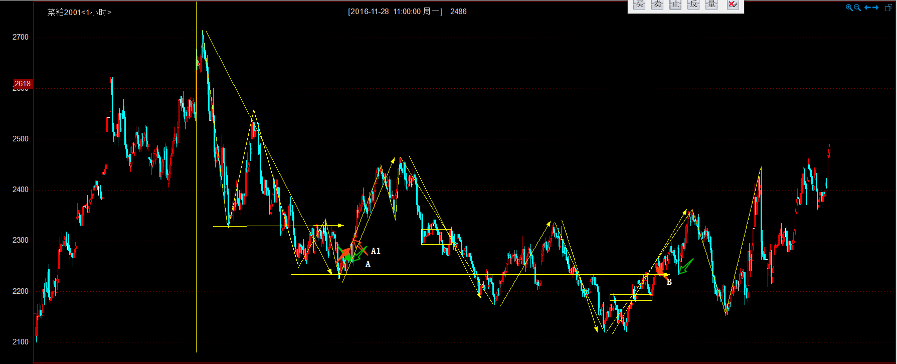 A: 60F结构上有力,15F三买确立后,1F图盘背套3F完备上,A1动止一次,A2冲高无力动止,A3 3F三笔反平仓。